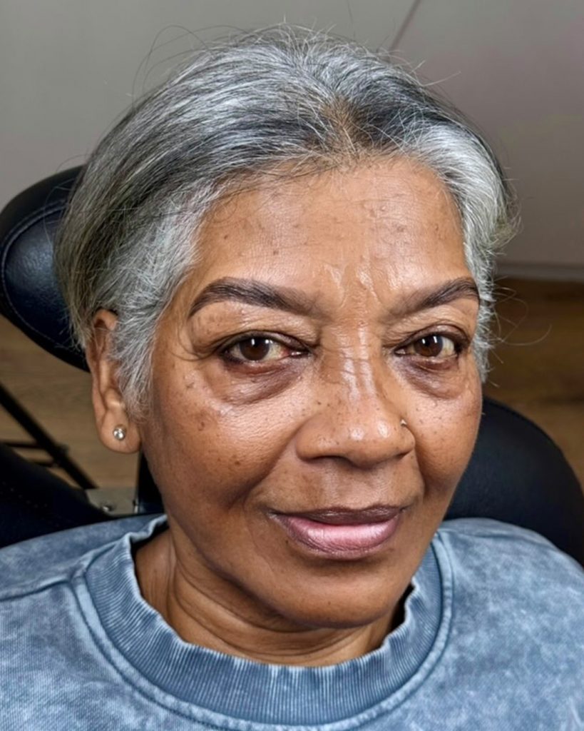 That philosophy carries through in every step of the process. Custom tinting is used to gently neutralise greys and create harmony with skin tone and hair colour. Lamination, when appropriate, can give a natural-looking lift and the illusion of fullness without adding stress to fragile hairs. And shaping is approached with a light hand, with it being less about creating bold lines and more about working with the client’s natural growth and bone structure. Regular brow maintenance becomes especially important after fifty. Not only does it keep brows tidy and symmetrical, but it also contributes to a fresher, more lifted appearance overall.